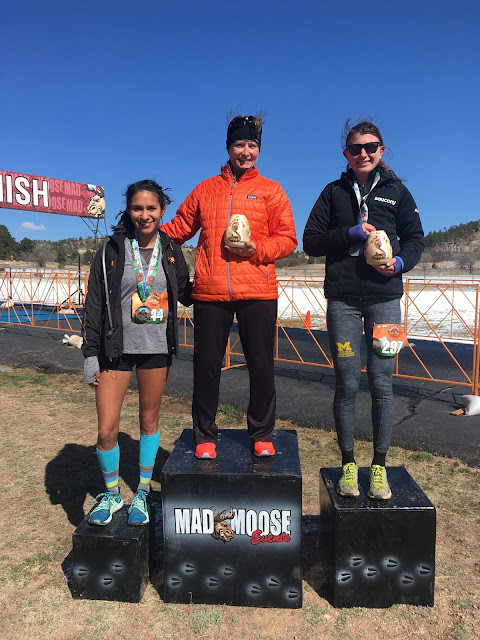 The start was very mellow thanks to the ice on the road. Nobody wanted to wipe out in first 10' of the race! Then we were on grass heading to the trails and the pace picked up. I found myself in fourth, running comfortably. As we hit the singletrack, I slid into third. Making a mental note of what the first and second place women were wearing, it was time to focus on the terrain. I'd made a few trips to Palmer over the last month to run various sections of the course, so I was pretty comfortable but it's still technical running. The first few miles are on Kinnikinnik, with plenty of rocks and punchy climbs. The rocks were made even trickier with the dusting of snow and hidden spots of ice. There was no racing yet, just running smart and having fun. I was in a small group of guys and we were moving pretty quick. They seemed happy to let me lead on the techy descents, but I knew they'd want to pass eventually. I wasn't ready to really push the pace yet. I wasn't event looking at my watch! Given that both my sleeve and jacket were covering my watch, I didn't really feel like struggling just to see the time or pace. Eventually, I'd look.